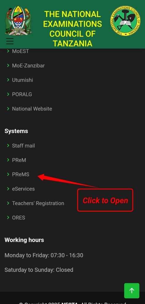 - Visit the Official NECTA PREMS Portal, which is accessible through the NECTA website, accessing it by navigating to the footer pages.